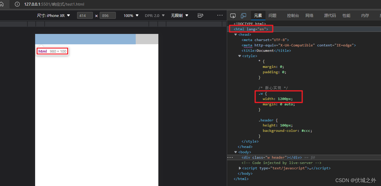 我们可以发现,虽然该网页的版心是1200px,但是移动端浏览器布局视口宽度还是默认的980px,即初始化包含块html元素的宽度。