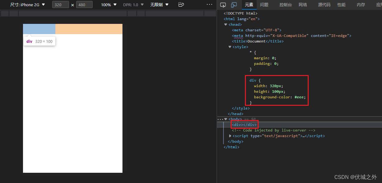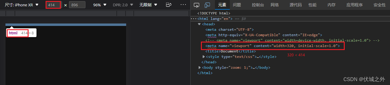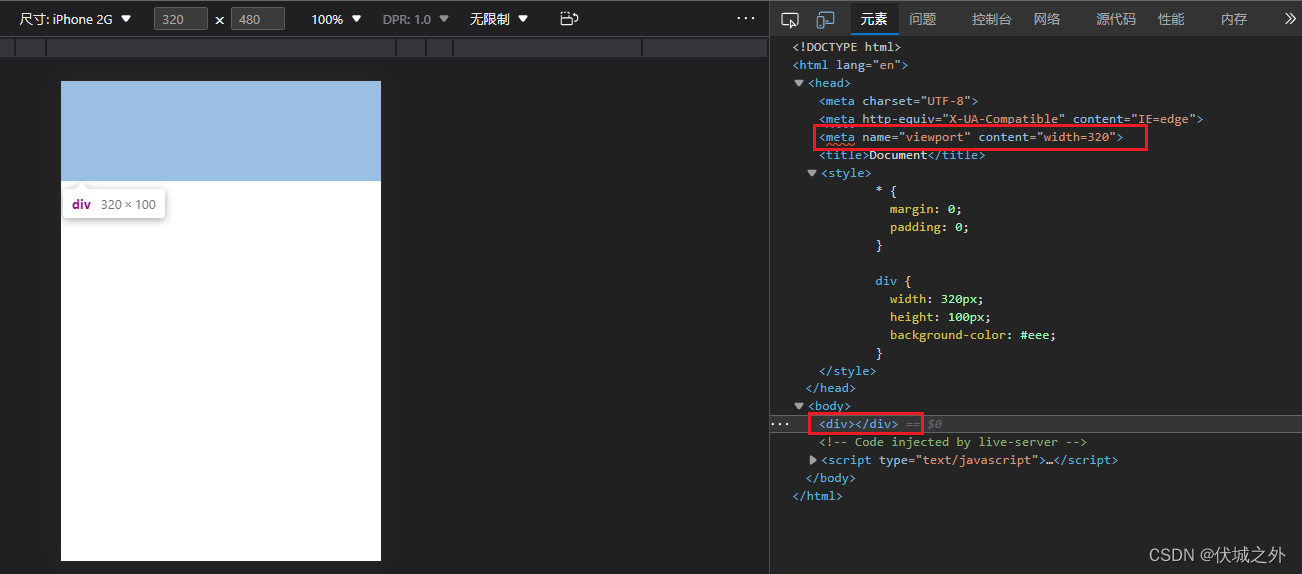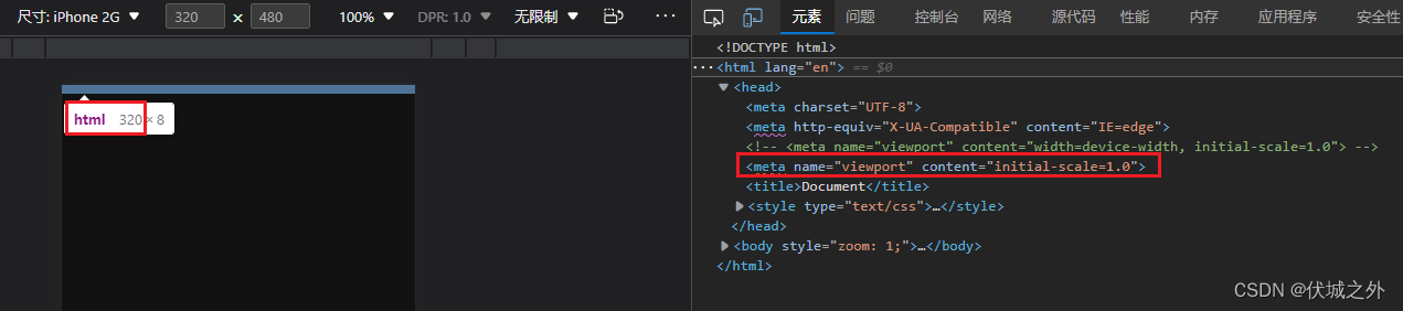 我这里将PC浏览器的视觉视口宽度缩小到了320px,高度缩小到了480px,来模拟早期iPhone 2G的屏幕逻辑分辨率大小。