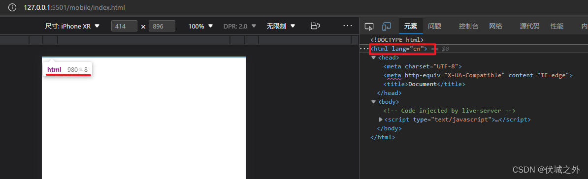 如下图中,在移动端浏览器中,html元素的宽度为980px,而移动端浏览器布局视口的默认宽度就是980px。