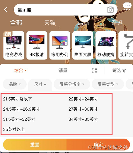 比如我们逛淘宝时,搜索显示器,在尺寸筛选栏中,看到的屏幕尺寸的英寸数,就是屏幕对角线的长度。