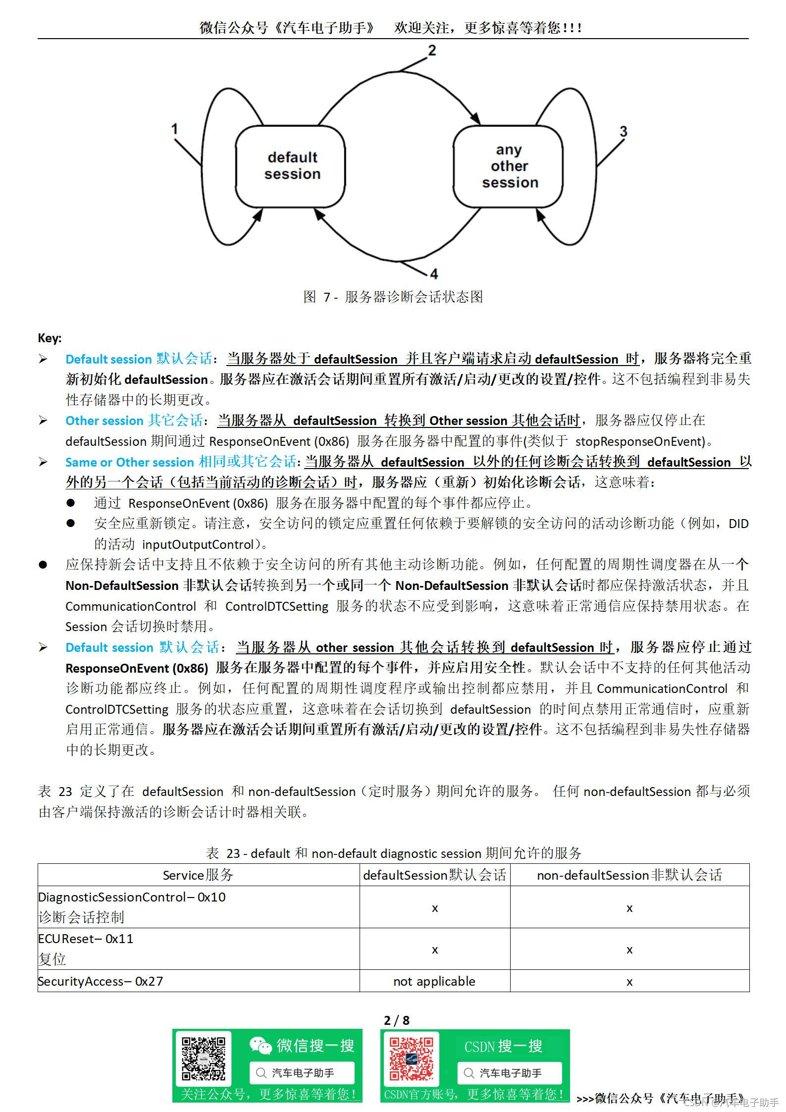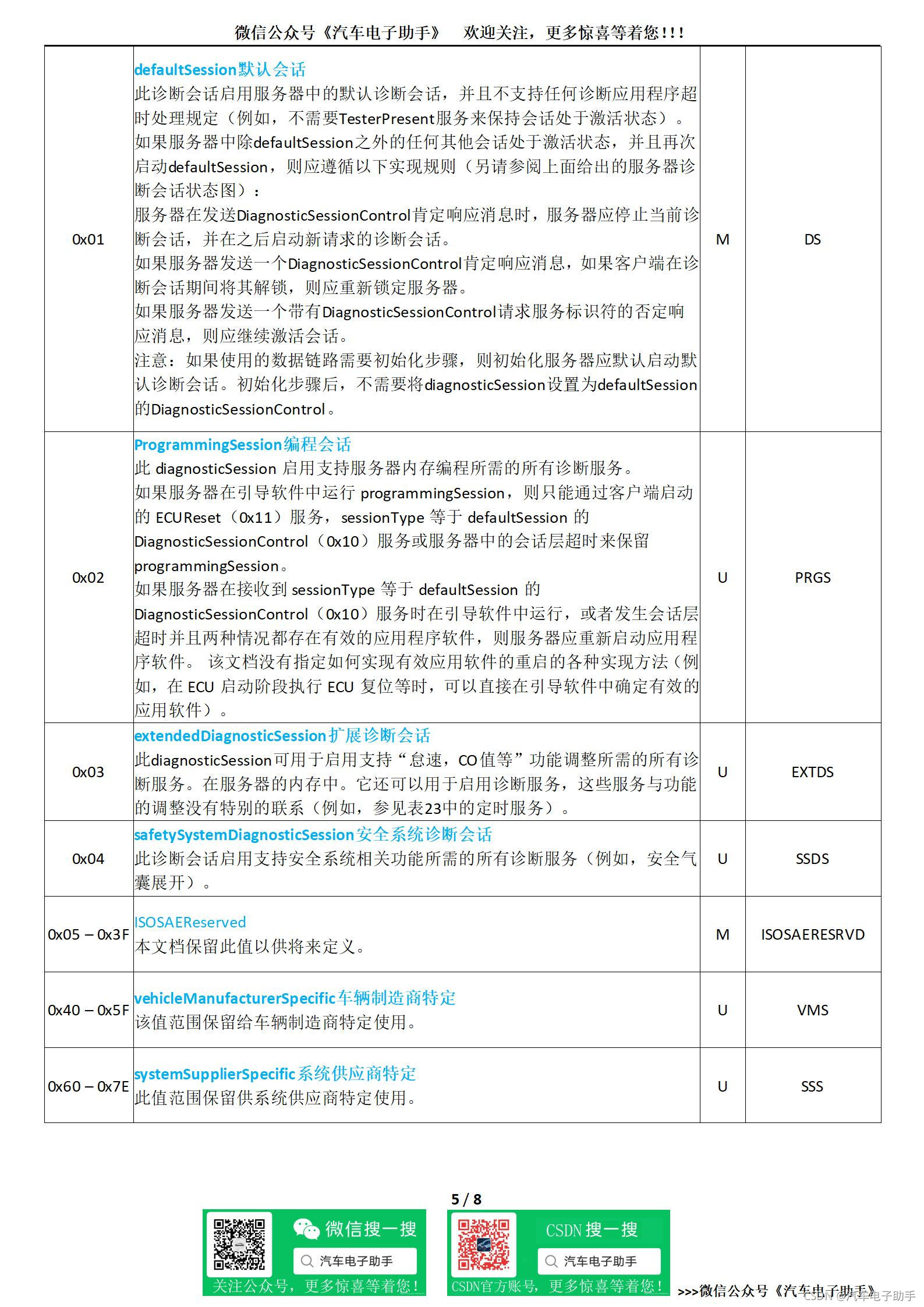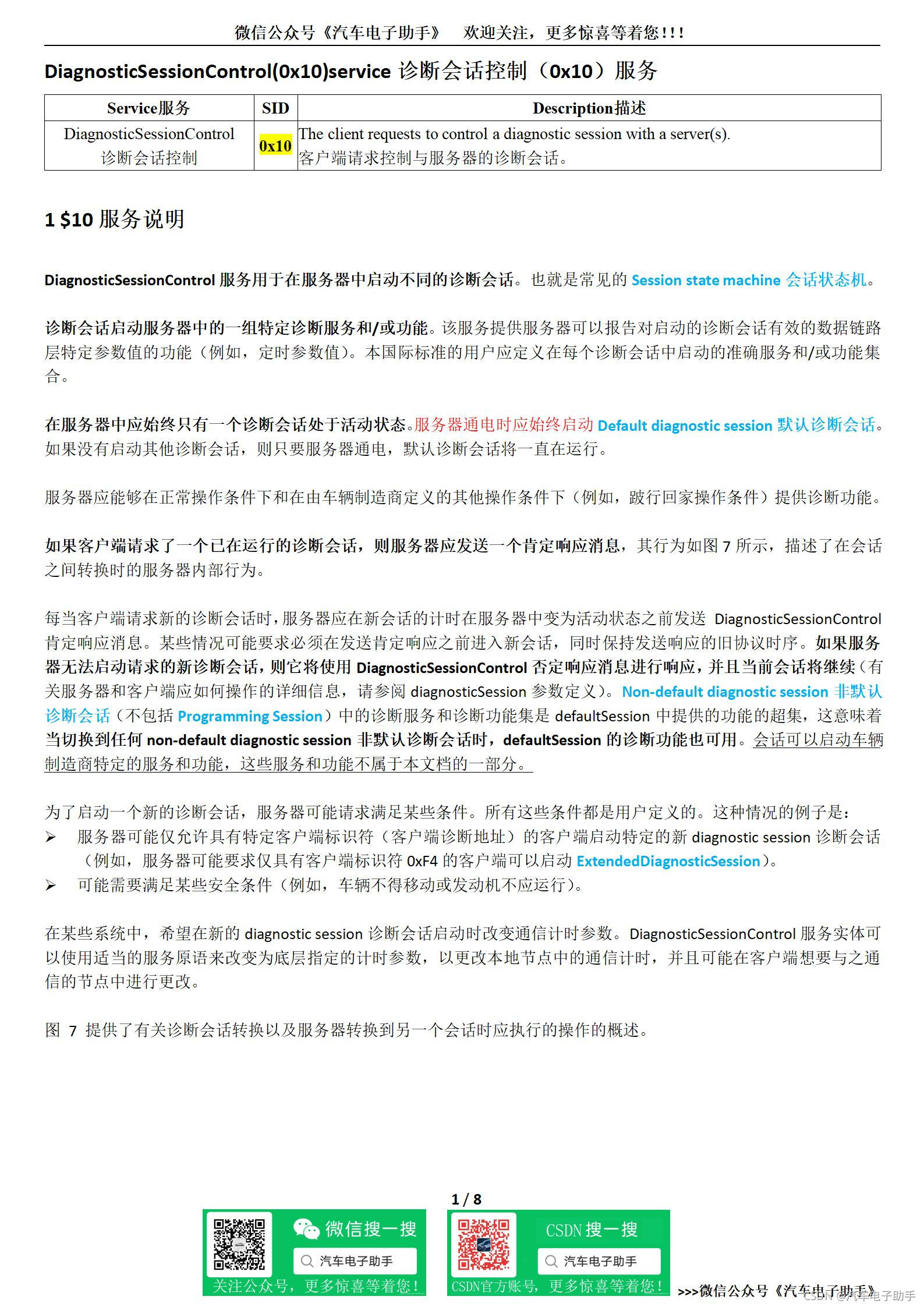| DiagnosticSessionControl 诊断会话控制 | 0x10 | 客户端请求控制与服务器的诊断会话。 |