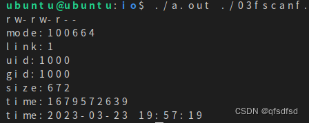 printf("mode:%o\nlink:%ld\nuid:%d\ngid:%d\nsize:%ld\ntime:%ld\ntime:%d-%02d-%02d %02d:%02d:%02d\n",