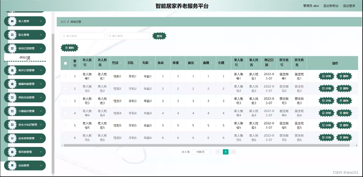 体检记录管理;在体检记录管理页面可以对老人账号,老人姓名,性别,手机,年龄,身高,体重,血压,血糖,心跳登,登记日期等内容进行详情或删除等操作,如图5-10所示。