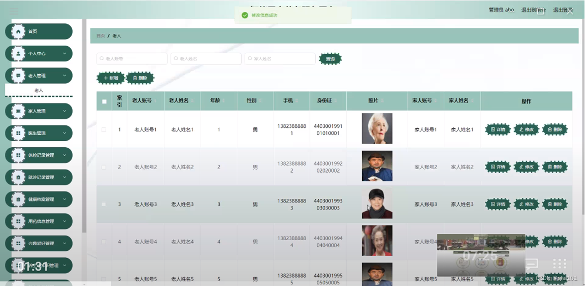 老人管理;在老人管理页面可以对用老人账号,老人姓名,年龄,性别,手机,身份证,图片,家人账号,家人姓名等内容进行详情,修改或删除等操作,如图5-8所示。