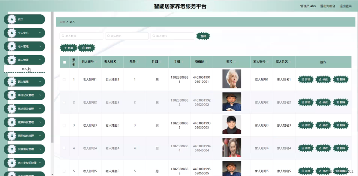 家人管理;在家人管理页面可以对老人账号,老人姓名,年龄,性别,手机,身份证,照片,家人账号,家人姓名等内容进行详情,修改或删除等操作,如图5-9所示。