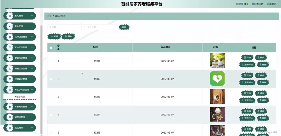 养生小知识管理;在养生小知识管理页面可以对标题,发布时间,封面等内容进行详情,修改,查看评论或删除等操作,如图5-12所示。