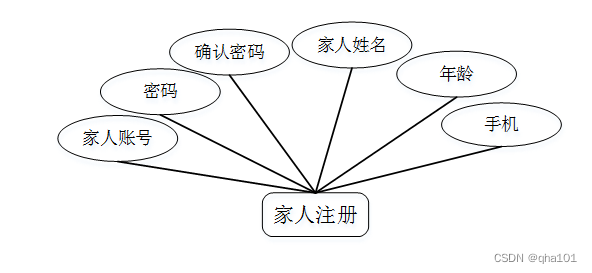 家人注册信息实体包括家人账号,密码,确认密码,家人姓名,年龄,手机等属性。家人注册信息实体图如图4-2所示: