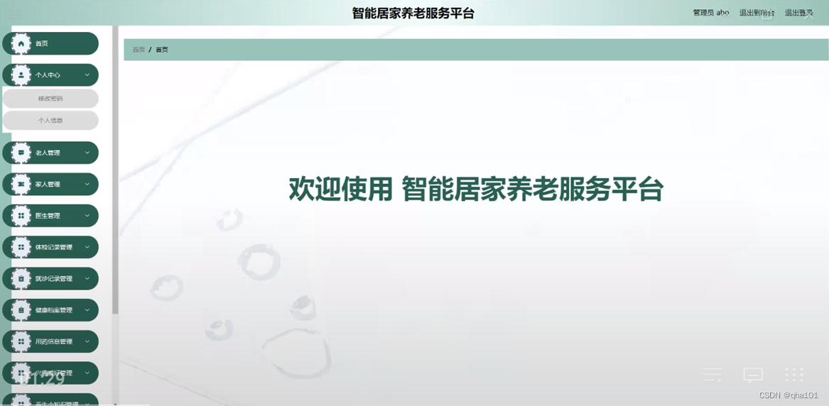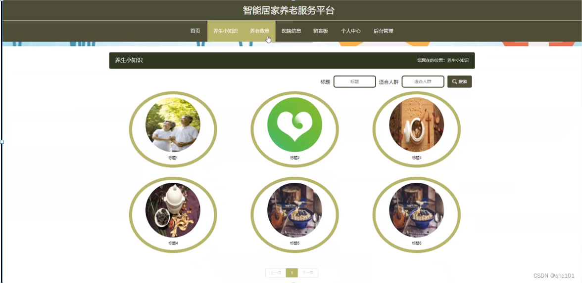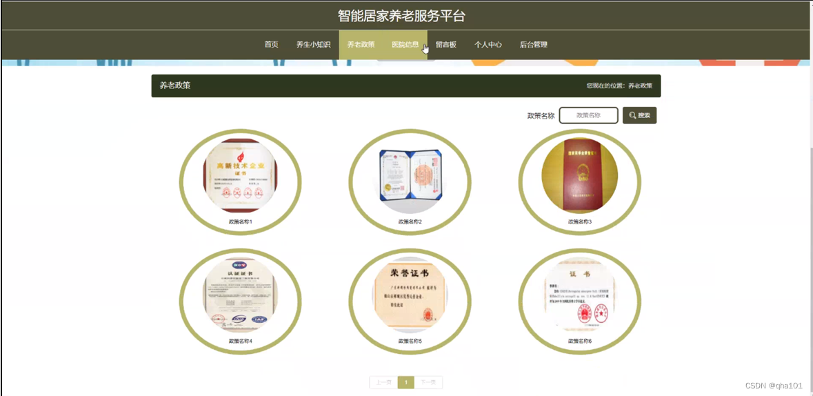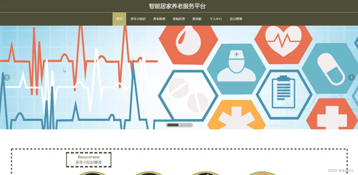 4、首页内容管理:管理员登录以后,可以对首页,养生小知识,养老政策,医院信息,留言板,个人中心,后台管理进行详细操作。