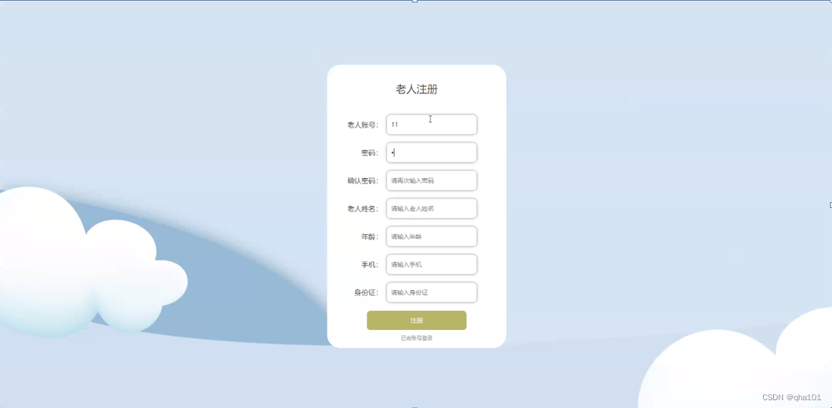 老人注册;在老人注册页面通过填写老人账号,密码,确认密码,老人姓名,年龄,手机,身份证等信息完成老人注册操作,如图5-4所示。