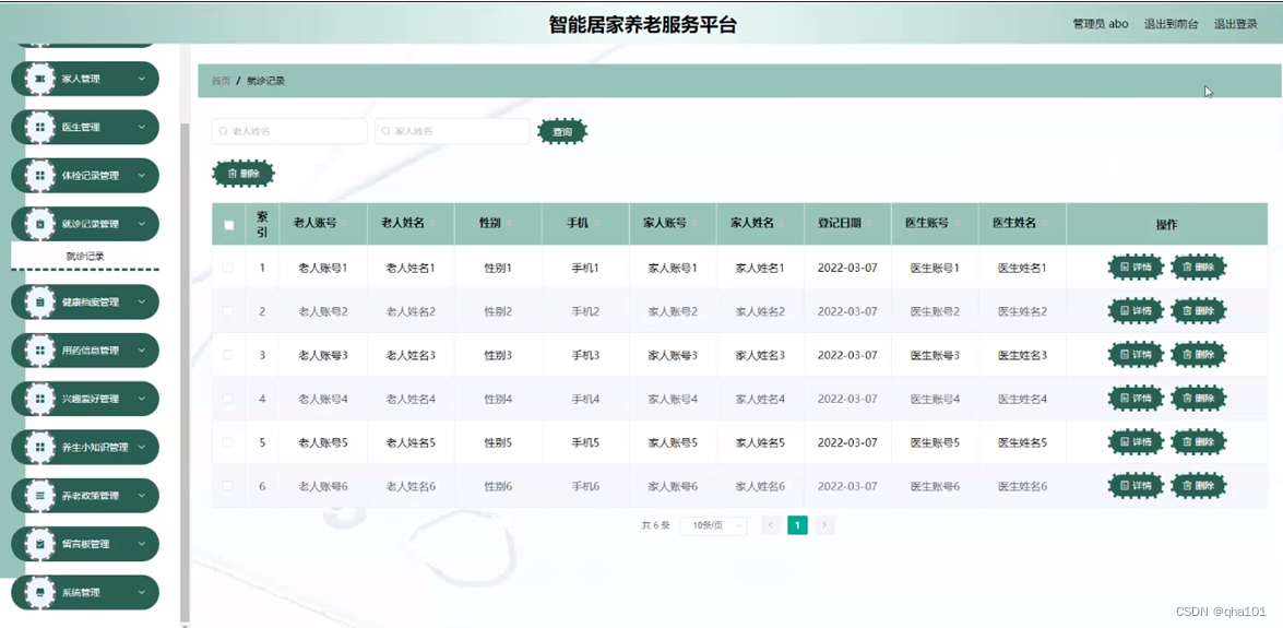 就诊记录管理;在就诊记录管理页面可以对老人账号,老人姓名,性别,手机,家人账号,家人姓名,登记日期,医生账号,医生姓名等内容进行详情或删除等操作,如图5-11所示。
