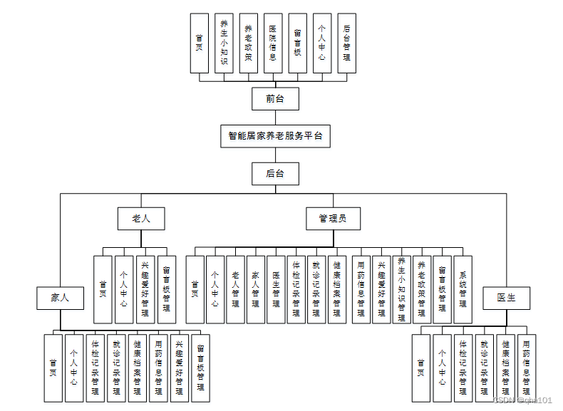 智能居家养老服务平台主要有四类用户。分别是管理员,家人,老人和医生,详细规划如图4-1所示。