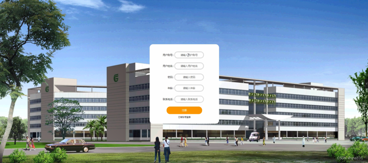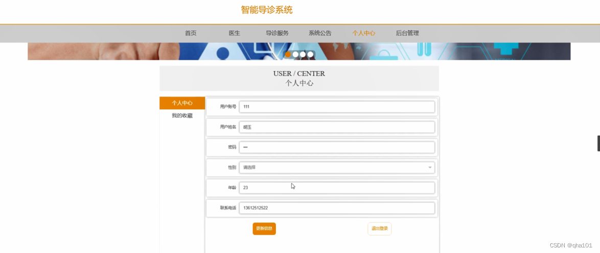 用户注册,在用户注册页面通过填写用户账号、用户姓名、密码、年龄、联系电话等信息完成用户注册,如图5-4所示。在个人中心页面通过填写用户账号、用户姓名、密码、性别、年龄、联系电话等信息进行更新操作,还可以根据需要对我的收藏进行详细操作;如图5-5所示。