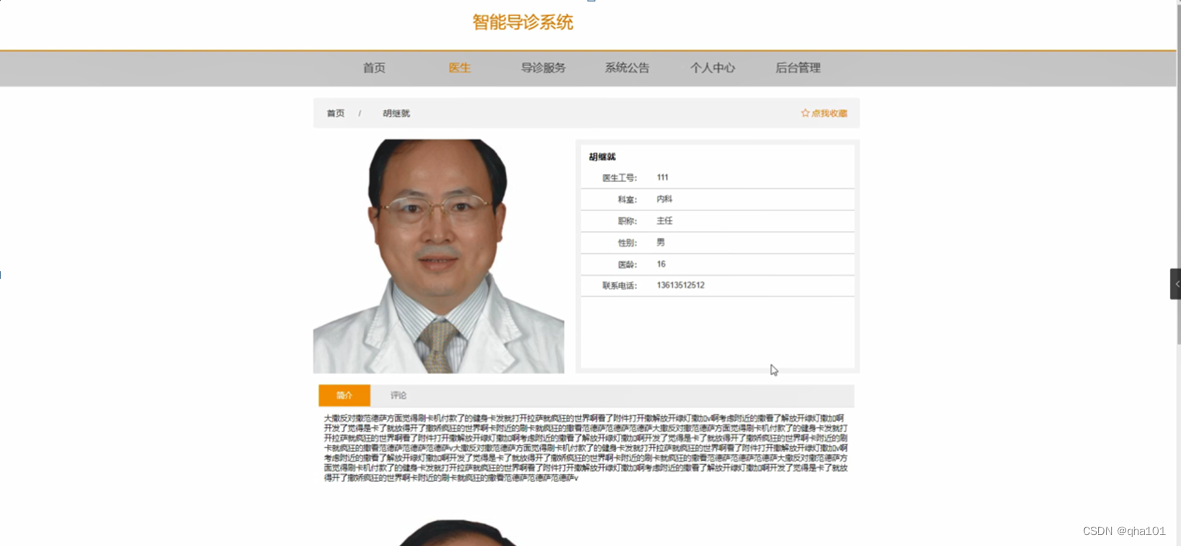 医生,在医生页面中可以查看医生姓名、医生工号、科室、职称、性别、医龄、联系电话、简介等信息,并进行评论或收藏等操作;如图5-2所示。