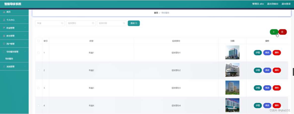 导诊服务管理,在导诊服务管理页面可以对索引、科室、症状部分、封面等信息进行详情,修改或删除等操作,如图5-11所示。