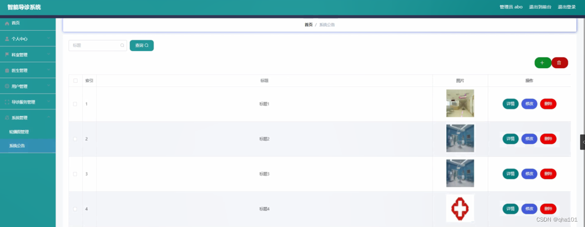 系统管理,在系统公告页面可以对索引、标题、图片等信息进行详情,修改或删除等操作,还可以根据需要对轮播图管理进行详细操作;如图5-12所示。