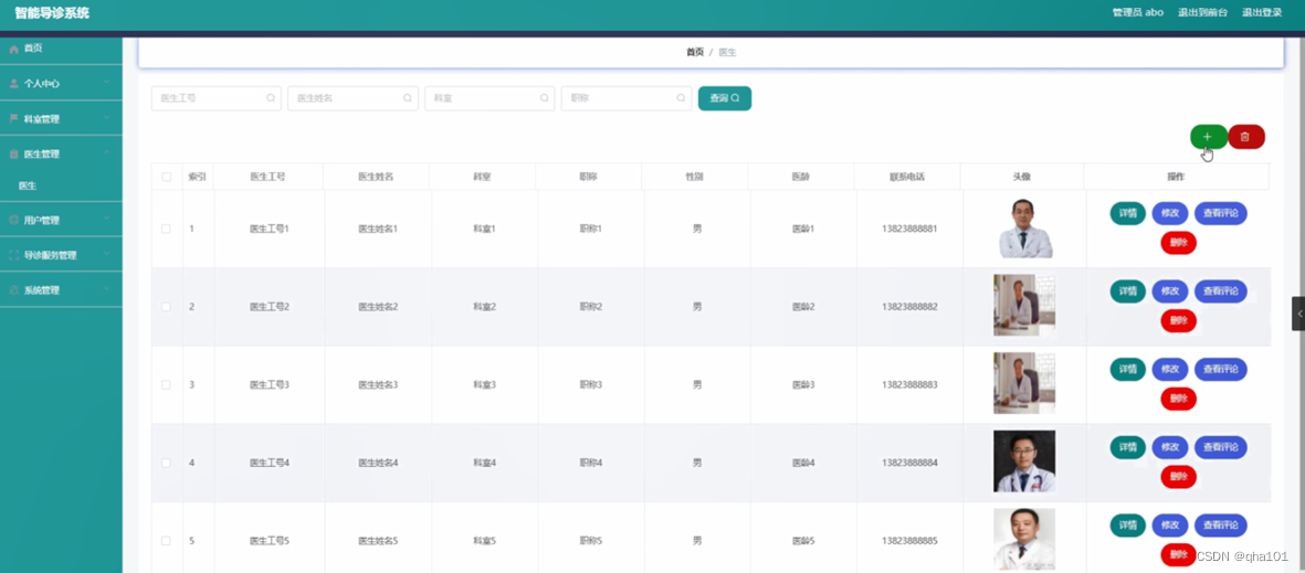 医生管理,在医生管理页面可以对索引、医生工号、医生姓名、科室、职称、性别、医龄、联系电话、头像等信息进行详情、修改、查看评论或删除等操作,如图5-9所示。