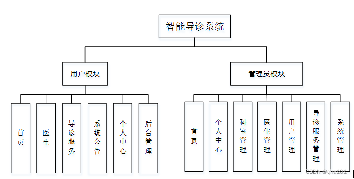 系统架构图属于系统设计阶段,系统架构图只是这个阶段一个产物,系统的总体架构决定了整个系统的模式,是系统的基础。智能导诊系统的整体结构设计如图4-2所示。