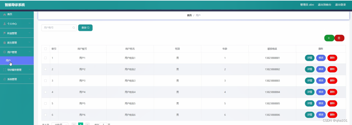 用户管理,在用户管理页面可以对索引、用户账号、用户姓名、性别、年龄、联系电话等信息进行详情,修改或删除等操作,如图5-10所示。