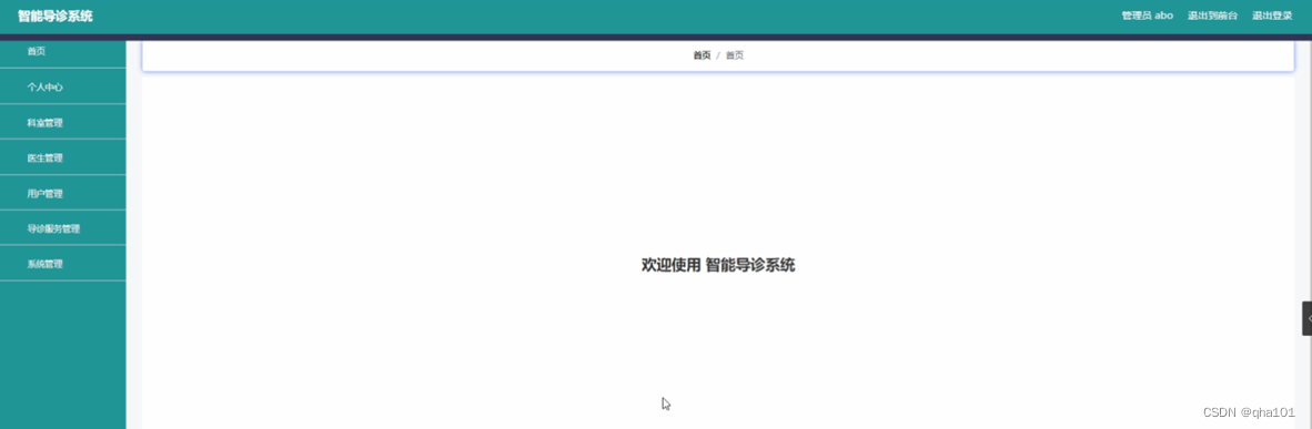 管理员登录进入智能导诊系统可以查看首页、个人中心、科室管理、医生管理、用户管理、导诊服务管理、系统管理等内容进行详细操作,如图5-7所示。