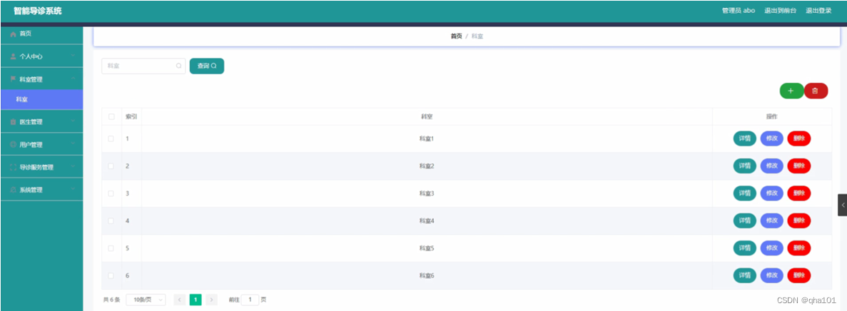 科室管理,在科室管理页面可以对索引、科室等信息进行详情,修改或删除等操作,如图5-8所示。