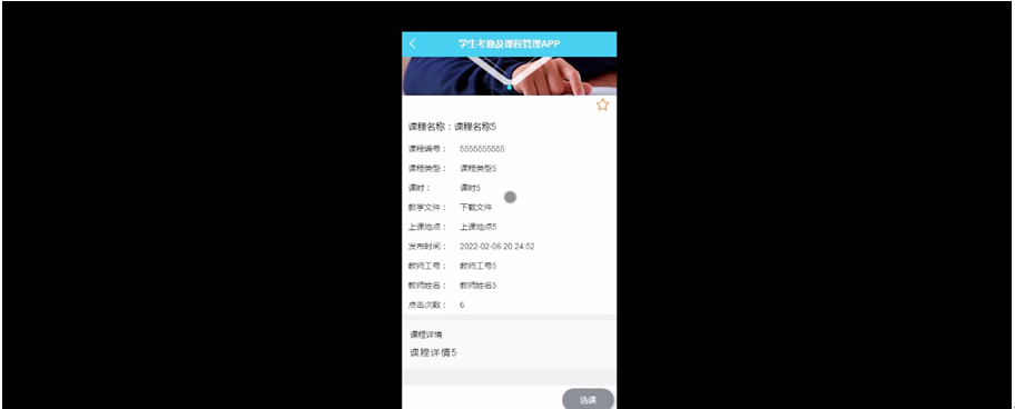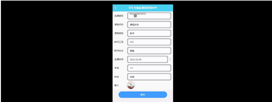 选课,学生可在课程信息页面通过点击选课,输入选课编号、课程名称、课程类型、教师工号、教师姓名、选课时间、学号、姓名、图片等内容进行提交等操作,如图4-6所示。