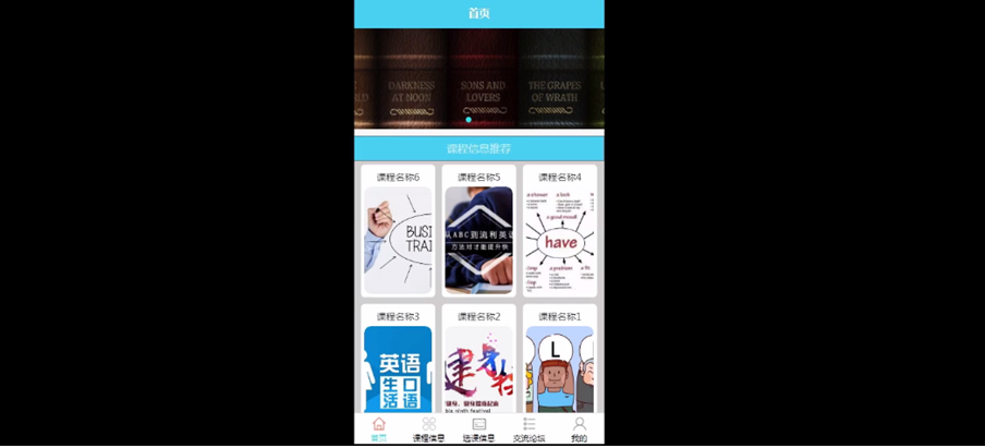学生通过登录进入学生考勤及课程管理APP首页可查看首页、课程信息、选课信息、交流论坛、我的等内容,在首页还可查看课程信息推荐等内容,如图4-3所示。