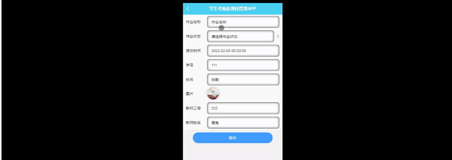 作业提交,学生可在作业提交页面通过输入作业名称、作业状态、提交时间、学号、姓名、图片、教师工号、教师姓名等内容进行提交等操作,如图4-7所示。