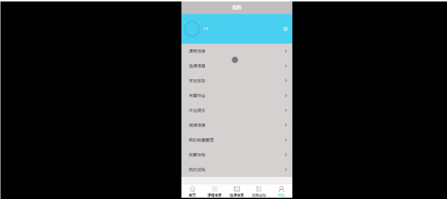 我的,学生在我的页面可查看用户信息、课程信息、选课信息、学生签到、布置作业、作业提交、成绩信息、我的收藏管理、我要发帖、我的发帖等内容,如图4-5所示。
