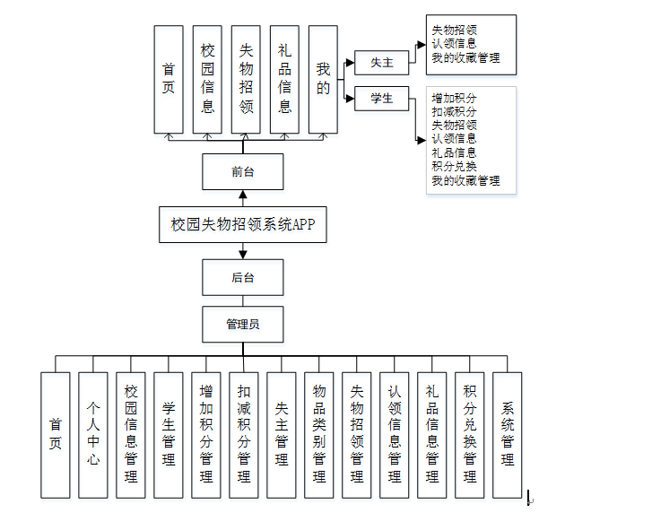 后台主要是管理员,管理员功能包括首页、个人中心、校园信息管理、学生管理、增加积分管理、扣减积分管理、失主管理、物品类别管理、失物招领管理、认领信息管理、礼品信息管理、积分兑换管理、系统管理等;
