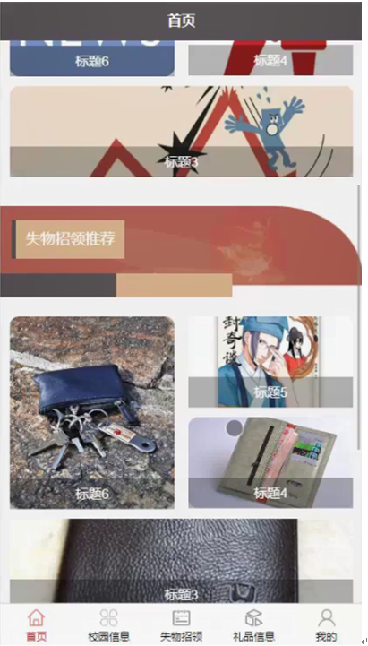 校园失物招领系统APP,在系统首页可以查看首页、校园信息、失物招领、礼品信息、我的等内容,并进行详细操作;如图4-3所示。