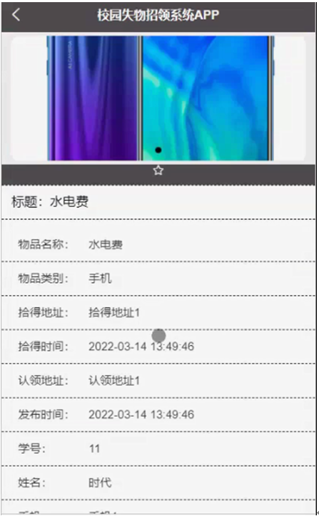 失物招领,在失物招领页面可以查看标题、物品名称、物品类别、拾得地址、拾得时间、认领地址、发布时间、学号、姓名、手机、物品描述、审核回复等内容,并根据需要进行评论或收藏等操作,如图4-5所示。