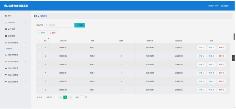 货物库存管理,在货物库存管理页面可以对索引、货物名称、规格、数量、货物来源、运输航线等内容进行详情,修改和删除等操作,如图5-5所示。