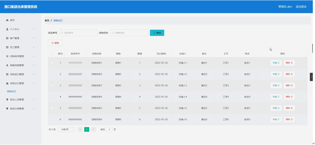 货物出口管理,在货物出口管理页面可以对索引、货运单号、货物名称、规格、数量、出口时间、交换人、备注、工号、姓名等内容进行详情和删除操作,如图5-8所示。