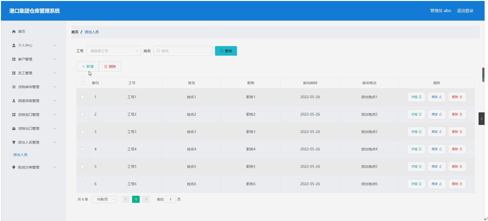 派出人员管理,在派出人员管理页面可以对索引、工号、姓名、职务、派出时间、派出地点等内容进行详情,修改和删除操作,如图5-9所示。