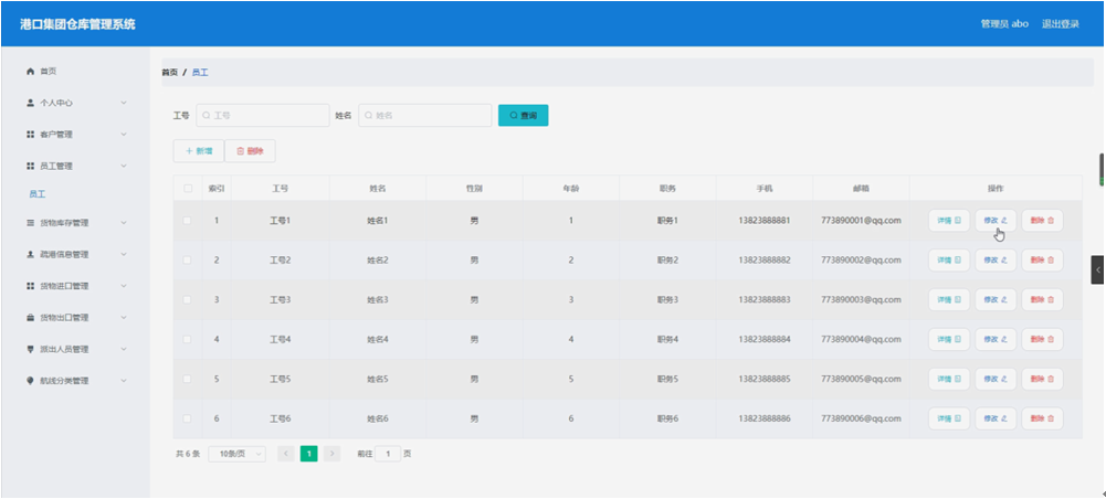员工管理,在员工管理页面可以对索引、工号、姓名、性别、年龄、职务、手机、邮箱等信息进行详情,修改和删除等操作,如图5-4所示。