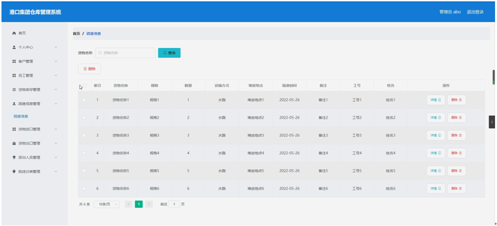 疏港信息管理,在疏港信息管理页面可以对索引、货物名称、规格、数量、运输方式、堆放地点、疏港时间、备注、工号、姓名等内容进行详情或删除等操作,如图5-6所示。