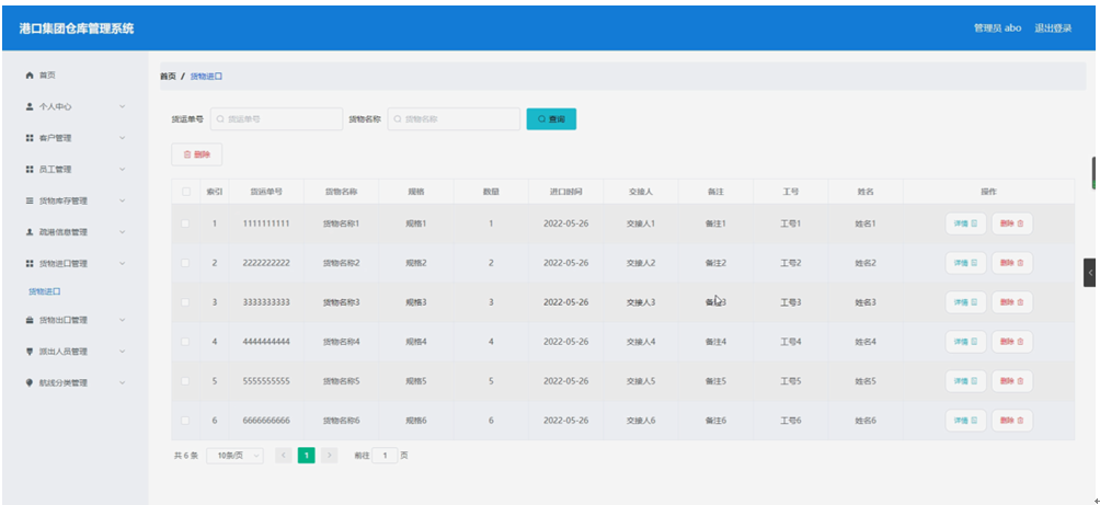 货物进口管理,在货物进口管理页面可以对索引、货运单号、货物名称、规格、数量、进口时间、交接人、备注、工号、姓名等内容进行详情和删除操作,如图5-7所示。