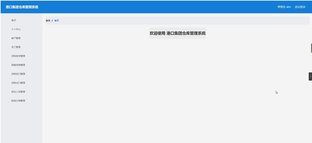 管理员登录系统后,可以对首页、个人中心、客户管理、员工管理、货物库存管理、疏港信息管理、货物进口管理、货物出口管理、派出人员管理、航线分类管理等功能进行相应的操作管理,如图5-2所示。