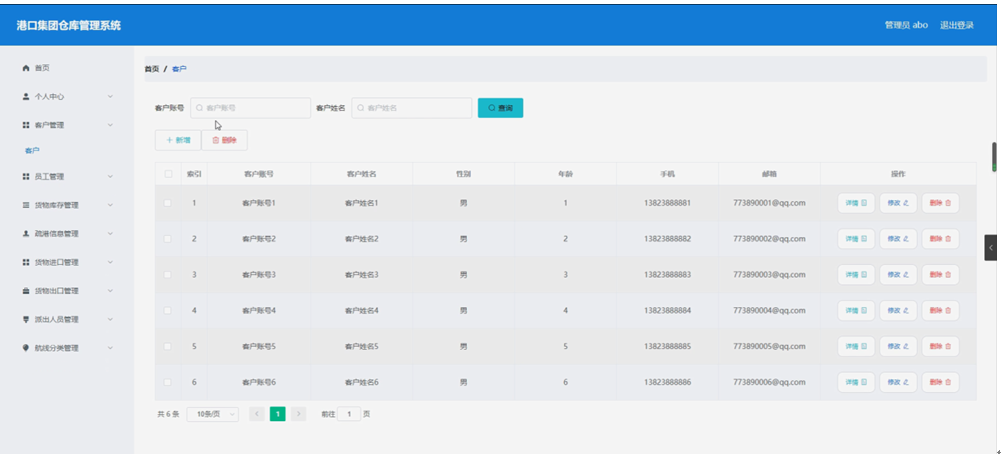 客户管理,在客户管理页面可以对索引、客户账号、客户姓名、性别、年龄、手机、邮箱等内容进行详情,修改和删除等操作,如图5-3所示。