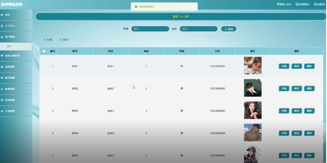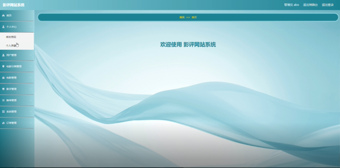 管理员登录系统后,可以对首页、个人中心、用户管理、电影分类管理,电影管理,影评管理,榜单管理,系统管理,订单管理等功能模块进行相应操作,如图5-7所示。