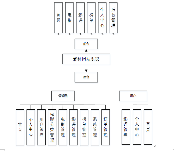 通过前面的功能分析可以将影评网站的功能分为管理员和用户两个部分,系统的主要功能包括首页、电影,影评,榜单,个人中心,后台管理等内容。任何用户只要进入网站不需登录也可浏览到的信息,后台管理是针对已登录的用户看到满意的电影评价的信息而设计的。