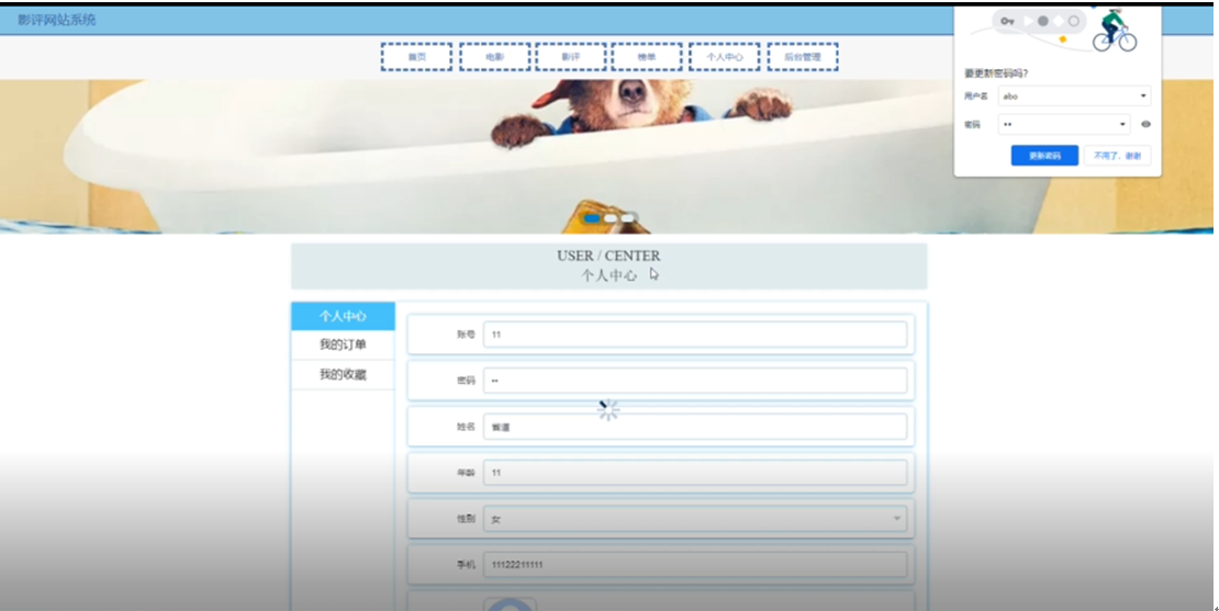 个人中心,在个人中心页面通过填写用户账号、密码、年龄,性别,手机,上传图片等信息进行更新信息,根据需要对我的订单,我的收藏进行详细操作,如图5-6所示。