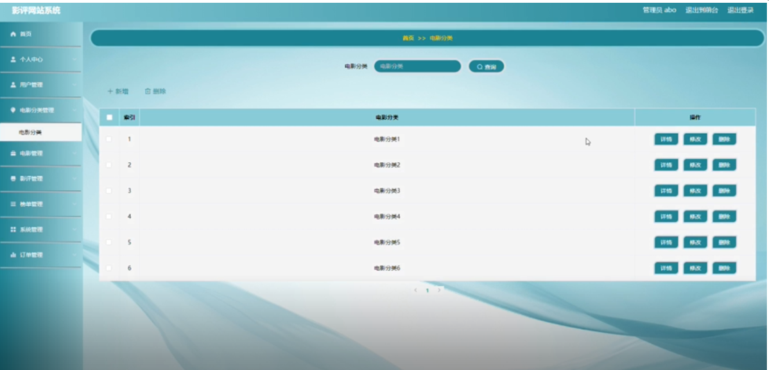 电影分类管理,在电影分类管理页面可以对电影分类内容进行详情,修改和删除等操作,如图5-9所示。