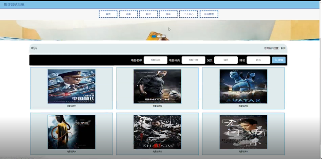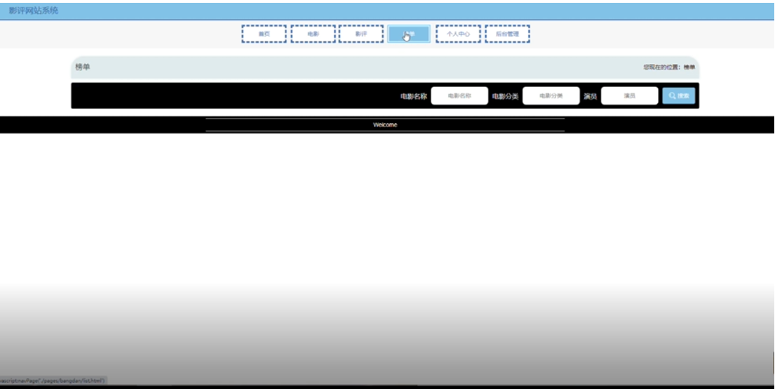影评网站系统,在系统首页可以查看首页、电影,影评,榜单,个人中心、后台管理等内容进行详细操作,如图5-1所示。