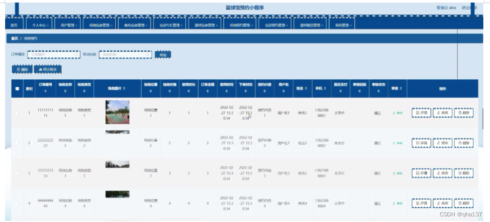 场地预约管理:在场地预约管理页面,可以查看订单编号、场地名称、场地类型、场地图片、场地位置、场地价格、使用时长、订单金额、使用时间、下单时间、用户名、姓名、手机、是否支付、审核回复、审核状态、审核等内容,还能进行详情、修改,删除,等操作,如图5-8所示: