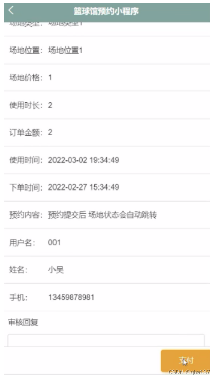 场地预约,在场地预约页面可以查看订单编号、场地名称、场地类型、场地图片、场地位置、场地价格、使用时长、订单金额、使用时间、下单时间、用户名、姓名、手机、是否支付、审核回复等信息进行支付等操作,如图5-14所示。