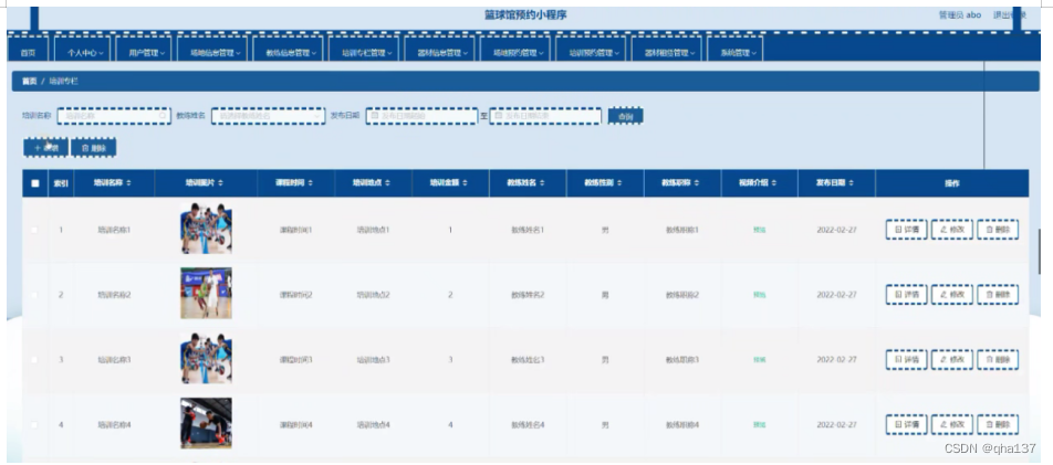 培训专栏管理:在培训专栏管理页面,可以查看培训名称、培训图片、课程时间、培训地点、培训金额、教练姓名、教练性别、教练职称、视频介绍、发布日期等内容,还能进行详情,删除等操作,如图5-6所示: