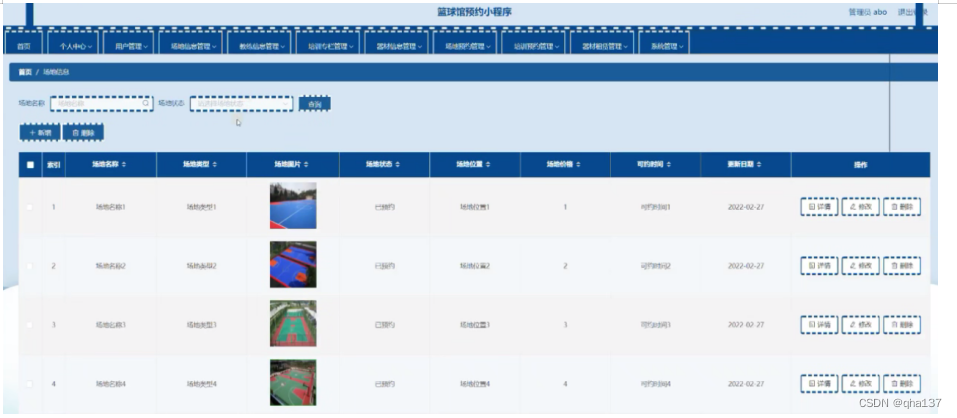 场地信息管理:在场地信息管理页面,可以查看场地名称、场地类型、场地图片、场地状态、场地位置、场地价格、可约时间、更新日期等内容,进行详情、修改、删除等操作,如图5-4所示: