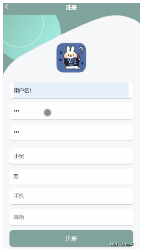 用户注册,在用户注册页面通过填写用户名、密码、确认密码、姓名、手机、邮箱等信息进行注册操作;如图5-10所示。
