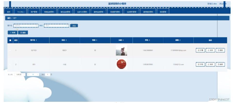 用户管理:在用户管理页面,可以查看用户名、姓名、头像、手机、邮箱等信息进行详情、修改、删除等操作,如图5-3所示: